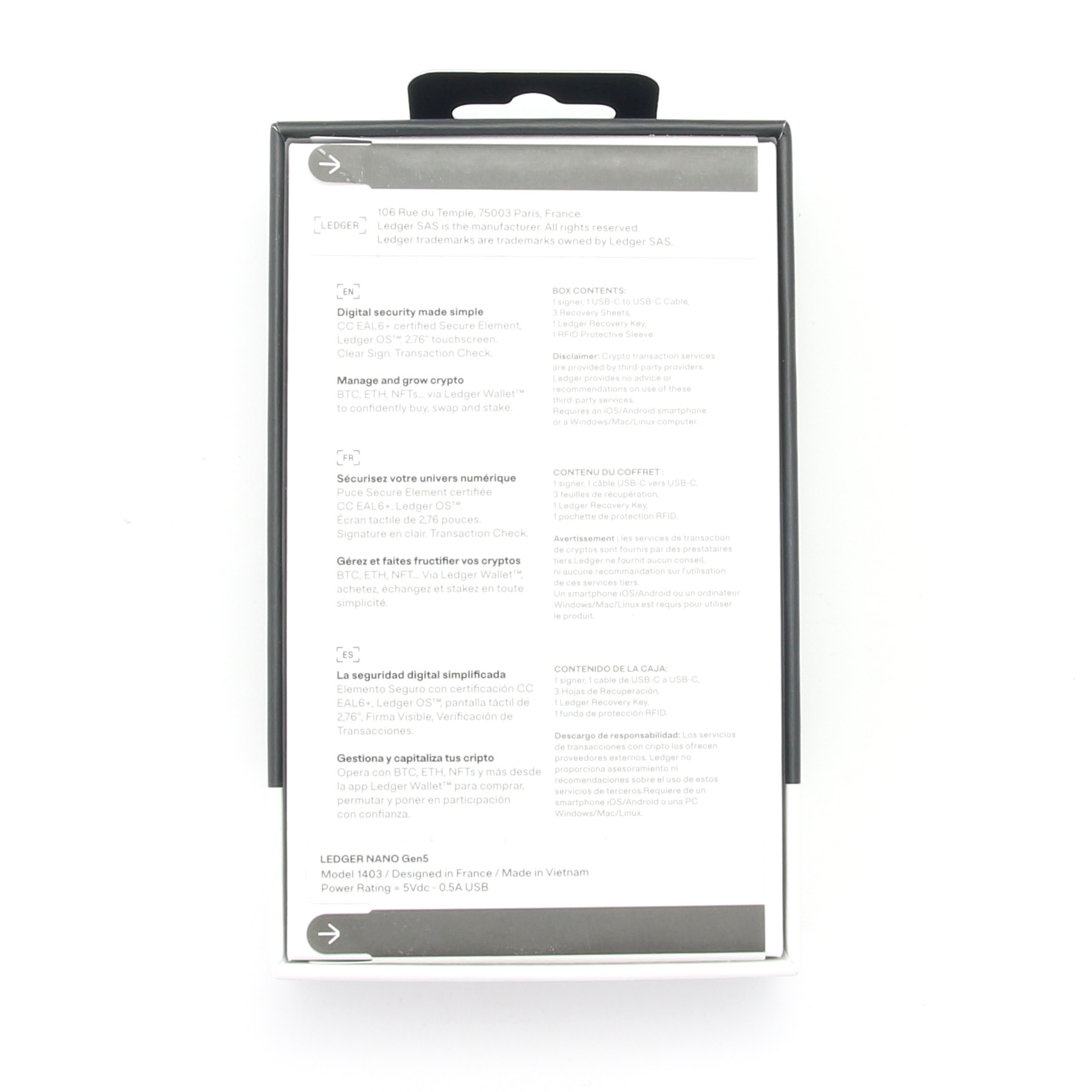 El Ledger Nano Gen5 ofrece todas las prestaciones de Ledger en términos de seguridad. El uso del Chip de Elemento Seguro EAL6+ en combinación con la Pantalla Segura y las nuevas protecciones de software, como la Comprobación de Transacciones, posicionan al Nano Gen5 como un dispositivo extremadamente seguro que también debería impresionar a los usuarios con conocimientos técnicos.
